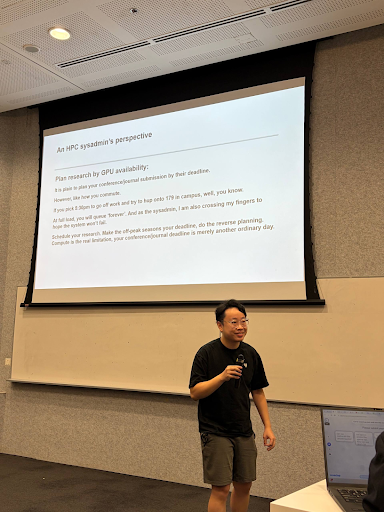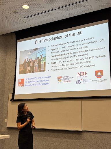 From the research community, Assisant Professor Li Haobo (NTU, School of Chemistry, Chemical Engineering and Biotechnology) shared how HPC enables her work in AI-driven energy chemistry, supporting high-throughput simulations and large-scale model training. She also offered practical insights on structuring workflows and estimating compute needs. Mr Wang Xiyu (NTU, School of Electrical and Electronic Engineering) complemented this with a practical perspective on benchmarking and workload estimation, drawing from his experience as both a researcher and system administrator