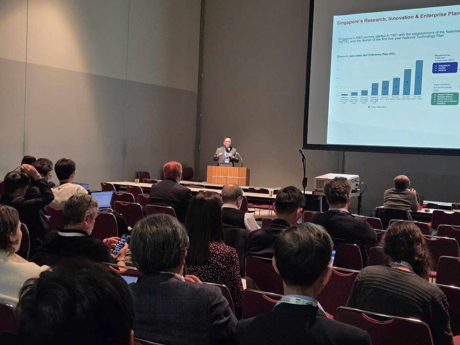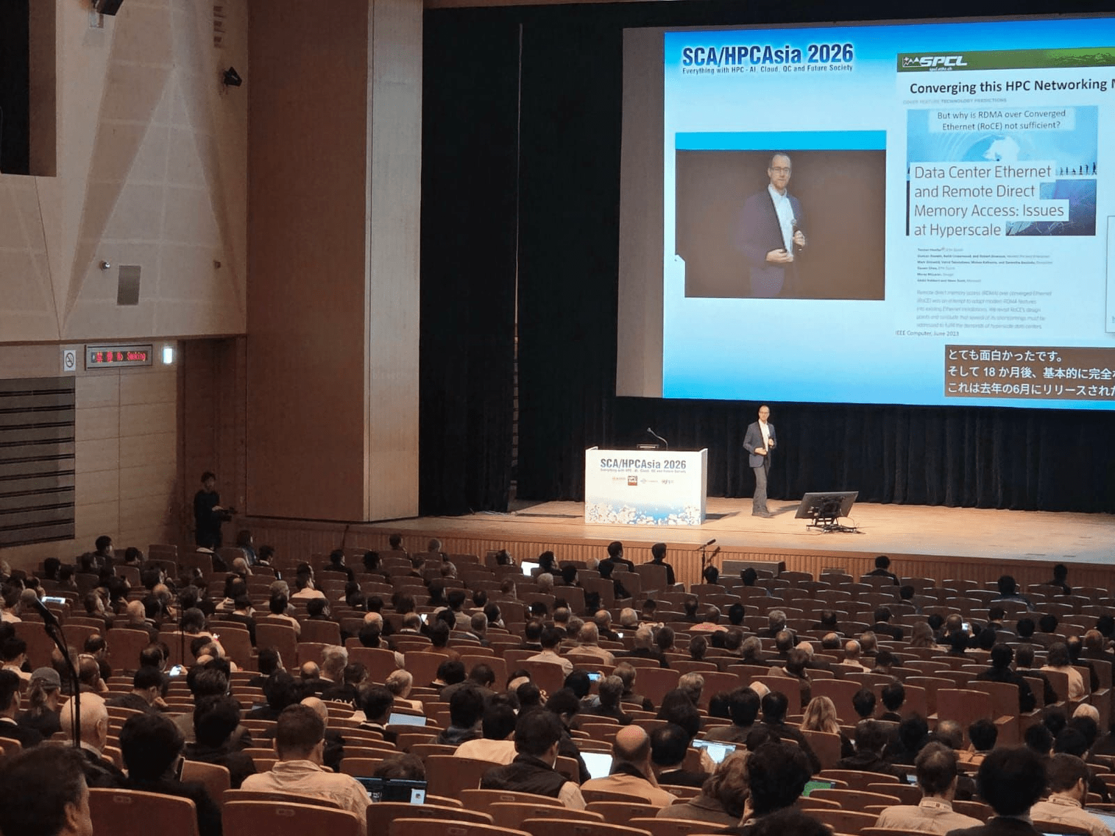 The conference opened with a strong emphasis on collective progress and collaboration, as conveyed by the conference’s general chairs, Prof Satoshi Matsuoka and Prof Hiroyuki Takizawa, as well as speakers from Japan’s Ministry of Education, Culture, Sports, Science and Technology, the United States Department of Energy (DOE), Argonne National Laboratory and more. NSCC Singapore’s Chairman also delivered a speech at the Opening Ceremony, underscoring the importance of international partnerships in advancing national and global HPC capabilities. This theme was further developed in the keynote by Prof Torsten Hoefler (ETH Zurich), who shared insights into Ultra Ethernet and its implications for next-generation AI and HPC workloads.